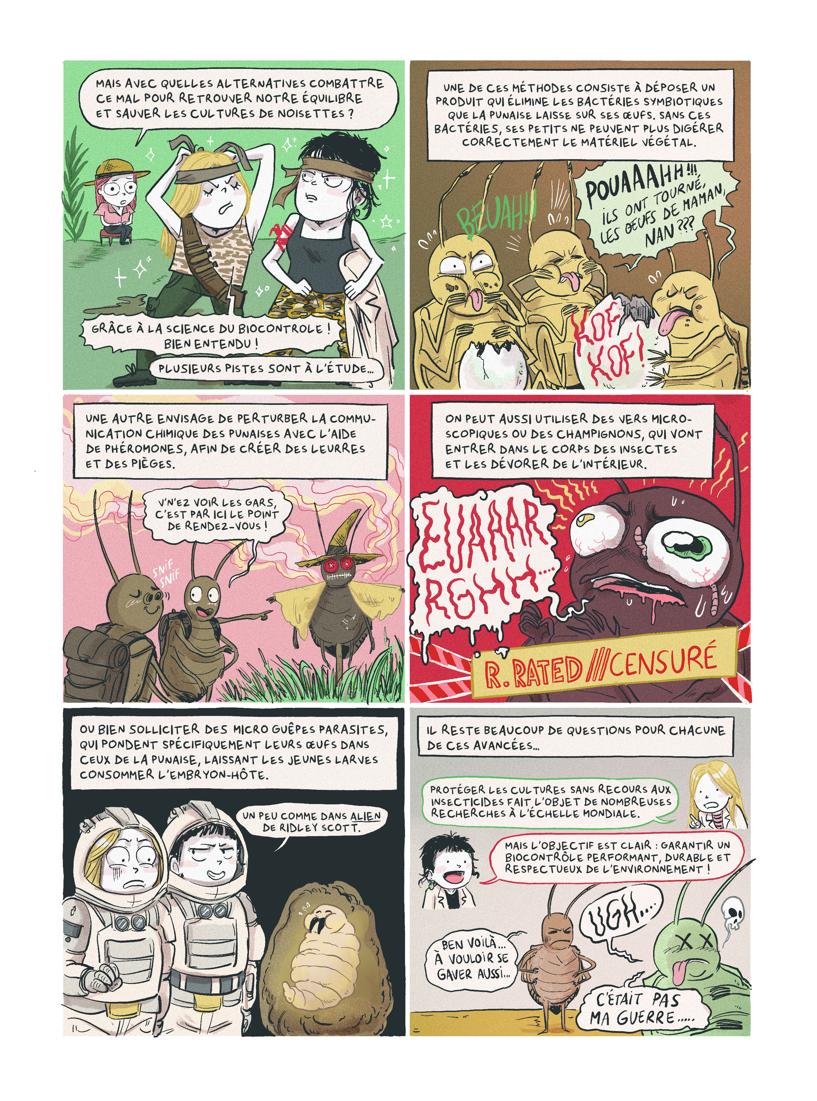 La découverte par ANPN, en collaboration avec le laboratoire RDLB de l’Institut Sophia Agrobiotech (INRAE) et le DISAFA (Université de Turin, Italie), du parasitoïde oophage Trissolcus japonicus (Ashmead), aussi appelée guêpe samouraï, et du Trissolcus mitsukurii (Ashmead) en Nouvelle-Aquitaine, est une piste prometteuse pour les producteurs de noisette [10, 11]. Comme la punaise diabolique, ces deux parasitoïdes sont originaires d’Asie de l’Est où ils se côtoient. Ces micro-guêpes qui ne mesurent que 2mm pondent spécifiquement leurs œufs dans ceux de la punaise. En consommant l’œuf, les jeunes larves de guêpe interrompent ainsi le cycle de reproduction du ravageur. Cela évoque le film Alien de Ridley Scott, où le xénomorphe se développe également au détriment de son hôte, qui, dans cette fiction, est l’humain. Ces deux espèces de parasitoïdes oophages n’ont pas été choisies au hasard par l’ANPN. Elles ont été sélectionnées parmi de nombreux candidats, car les enjeux économiques et environnementaux sont trop importants pour se tromper. Parmi les critères clés retenus, on retiendra par exemple une forte affinité pour la punaise diabolique, pour garantir une action ciblée et éviter les impacts sur d’autres espèces et un sex-ratio (le rapport des sexes d'une population) favorable aux femelles, car ce sont elles qui parasitent les œufs. Plus il y a de femelles, plus la population peut se multiplier efficacement, que ce soit dans la nature ou en élevage. Et enfin, une capacité à être produites en grand nombre dans des conditions contrôlées.