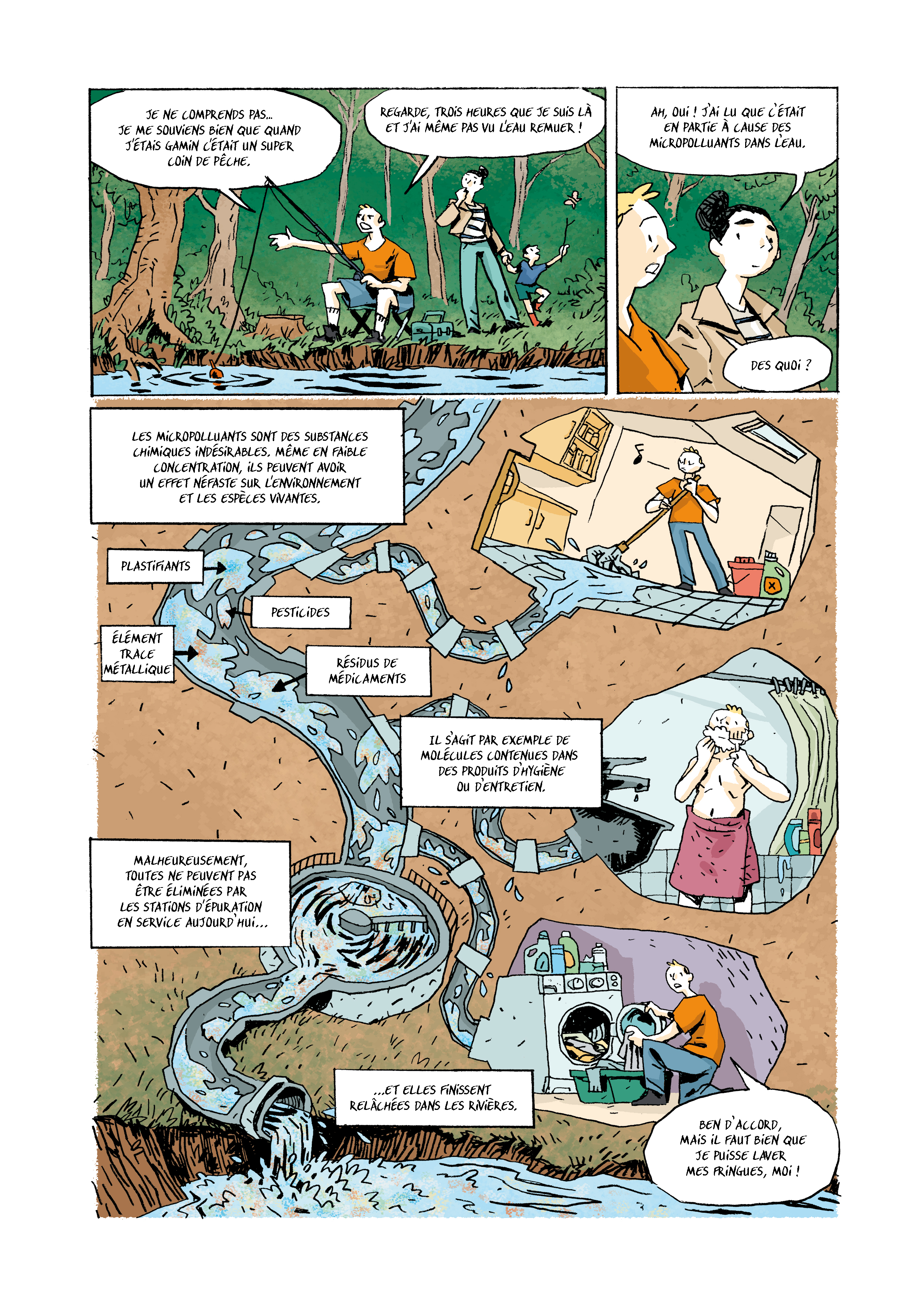 Pour la source domestique, les analyses chimiques des eaux usées et les réponses de plus de 1 000 personnes à un questionnaire et de plus de 250 personnes à un atelier participatif ont permis d’identifier les pratiques quotidiennes comme étant à l’origine de micropolluants dans l’eau. Médicaments et cosmétiques (contenant des filtres UV et des parabènes utilisés comme conservateurs), mais aussi gels douche, shampoings, produits vaisselle et lessives (contenant des détergents) sont autant de produits chimiques du quotidien qui ont été identifiés comme générant de la pollution.