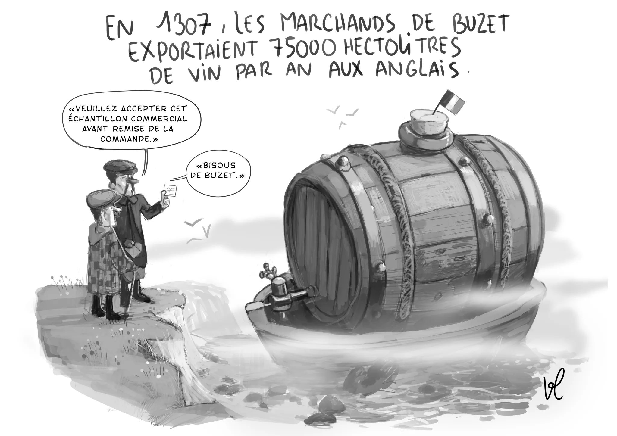 Cela n’empêcha pas la région de Buzet d’être extrêmement productive : au début du XIVe siècle, les marchands de la zone corres- pondant peu ou prou à l’AOC Buzet exportaient en une année près de 80 000 hectolitres de vin vers l’Angleterre, chiffre énorme même comparé à la production actuelle ! Nous avons aussi mis en avant la réputation des vins blancs « pourris », des vins moelleux aux vendanges très tardives ( jusqu’en janvier !), que l’on comparait au XVIIIe siècle avec les meilleurs vins doux espagnols.