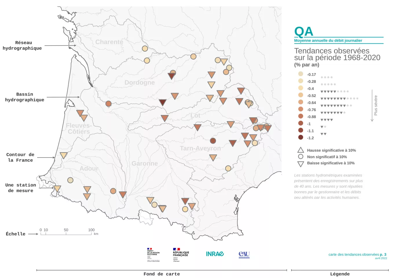 Prenons en exemple le cas de la carte de l’analyse de tendance pour le débit annuel QA sur la période 1968-2020. Sur cette représentation, les stations étudiées sont identifiées par un symbole qui diffère selon l’évolution de la tendance. En l’absence d’évolution significative – autrement dit, si le test n’apporte pas la preuve d’un changement notable de débit –, le symbole est un rond de couleur. Dans le cas contraire, on utilise un triangle coloré pointant vers le haut si la tendance est à la hausse, et un triangle coloré pointant vers le bas si la tendance est à la baisse. Le choix des couleurs des symboles varie d’un point à un autre. Plus la couleur est foncée, plus l’intensité du changement (exprimée en % par an) est marquée ; à l’inverse, plus la couleur est claire, moins le changement est important. La légende est accompagnée d’un histogramme qui décrit la distribution statistique des valeurs des changements sur les 56 stations de mesure (en distinguant tendances significatives « triangle » des non significatives « rond »). L’allure générale de l’histogramme permet d’évaluer la disparité des changements, un histogramme de forme étalée signifiant une grande variabilité de ceux-ci, alors qu’un histogramme resserré suggère des variations plus homogènes.