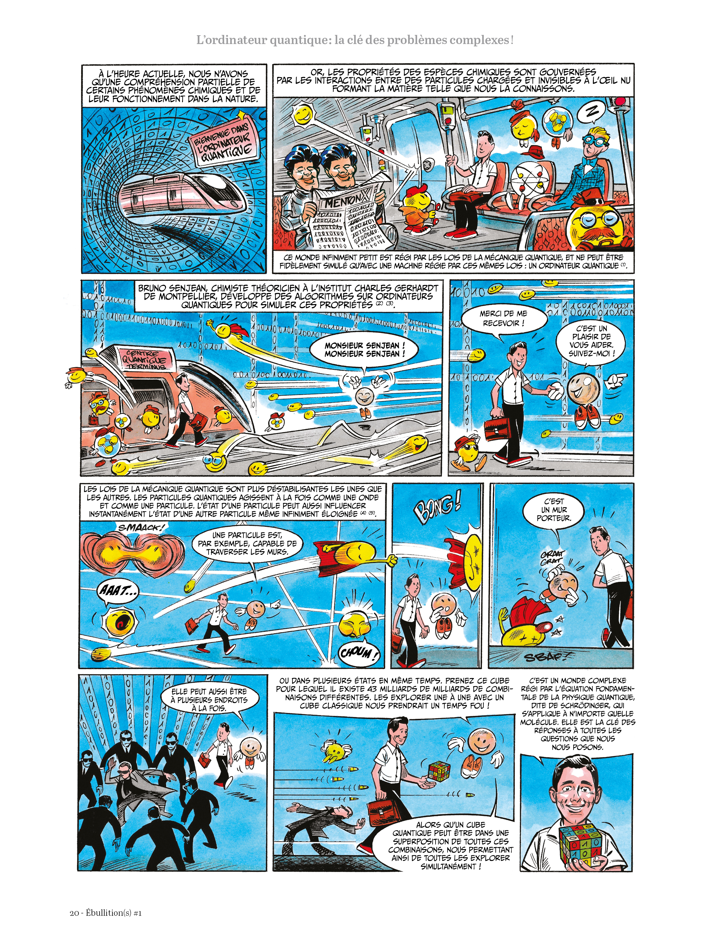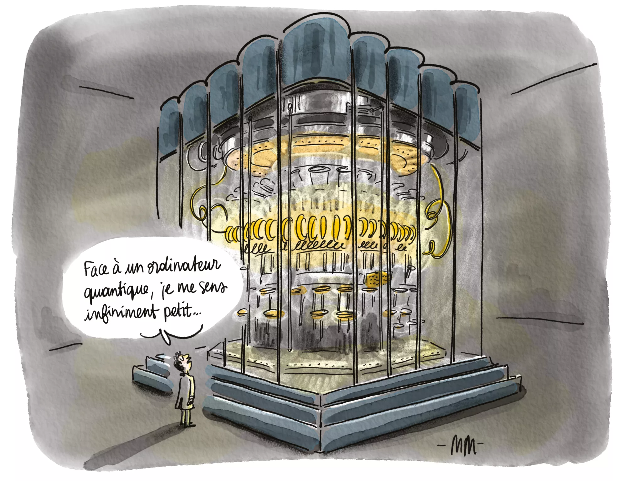 « La nature n’est pas classique […], et si vous voulez faire une simulation de la nature, vous feriez mieux de la faire quantique, et bon sang c’est un problème merveilleux car ce n’est pas si facile. » Cette citation de Richard Feynman en 1982 laisse entendre une chose : les ordinateurs classiques, tels que nous les connaissons, ne peuvent pas efficacement modéliser la nature, car ils n’obéissent pas aux mêmes lois. Pour décrire efficacement les phénomènes physico-chimiques qui s’y produisent, il faut une machine régie par la même physique: la mécanique quantique. C’est la naissance des ordinateurs quantiques [1], et s’ils n’étaient au départ qu’un pur produit de l’imagination, ils existent à présent bel et bien! Ces derniers ne ressemblent en rien aux ordinateurs classiques: certains sont construits à base de circuits électro niques supraconducteurs (La supraconductivité est un phénomène physique caractérisé par l’absence de résistance électrique et l’expulsion du champ magnétique (l’effet Meissner) à l’intérieur de certains matériaux, dits supraconducteurs, qui peuvent transporter de l’électricité sans perte d’énergie. Elle se manifeste à des températures proches du zéro absolu et s’explique grâce aux caractéristiques quantiques de la matière) fonctionnant à une température proche du zéro absolu (Il s’agit de la température la plus basse qui puisse exister : -273.15°C), d’autres sont composés d’ions piégés par des champs électromagnétiques, et d’autres utilisent des photons (les particules composants la lumière), pour créer les superpositions d’états quantiques. Un ordinateur quantique prend tellement de place qu’il pourrait remplir tout l’espace de votre salle à manger! C’est un peu comme si nous étions retournés dans les années quarante avec l’invention des premiers ordinateurs qui faisaient la taille d’un appartement. Et la taille n’est pas le seul problème: il est en effet important de se souvenir qu’un état quantique en superposition est très éphémère, très instable. Maintenir un tel état sur un ordinateur quantique est un véritable défi, nécessitant des technologies de pointe et des conditions expérimentales extrêmes comme atteindre une température proche du zéro absolu. De très nombreuses entre- prises, start-up, chercheuses et chercheurs travaillent d’arrache-pied pour développer un ordinateur quantique stable sur un temps suffisamment long afin qu’il soit possible de manipuler l’information quantique à notre guise, mais il reste encore un très long chemin à parcourir.