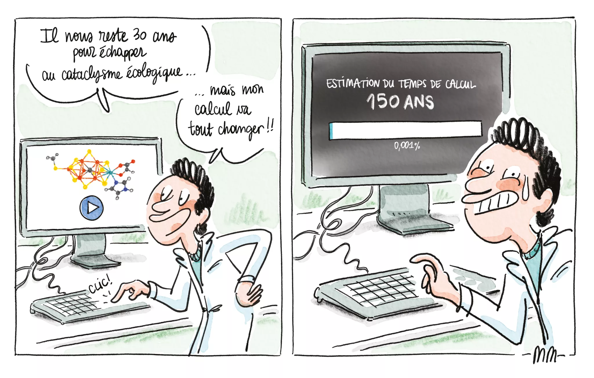 Tout ceci ne facilite pas la tâche des chimistes théoriciens, qui s’acharnent encore aujourd’hui à résoudre l’équation fondamentale de la physique quantique, proposée en 1925 par Erwin Schrödinger (prix Nobel de physique en 1933) pour décrire l’évolution d’un système quantique. Résoudre cette équation pour n’importe quelle molécule nous donnerait toutes les réponses nécessaires à la compréhension des phénomènes qui nous intéressent. Fantastique, non? Cependant, ce n’est pas si simple, car cette équation décrit un problème de plusieurs particules en interaction impossible à résoudre à la main. L’utilisation des ordinateurs est alors indispensable, mais le problème est tellement complexe (sa complexité augmentant de manière exponentielle par rapport au nombre de particules) qu’il nécessite un temps de calcul et des quantités de mémoire gigantesques. Obtenir des résultats intéressants peut alors prendre plusieurs années!