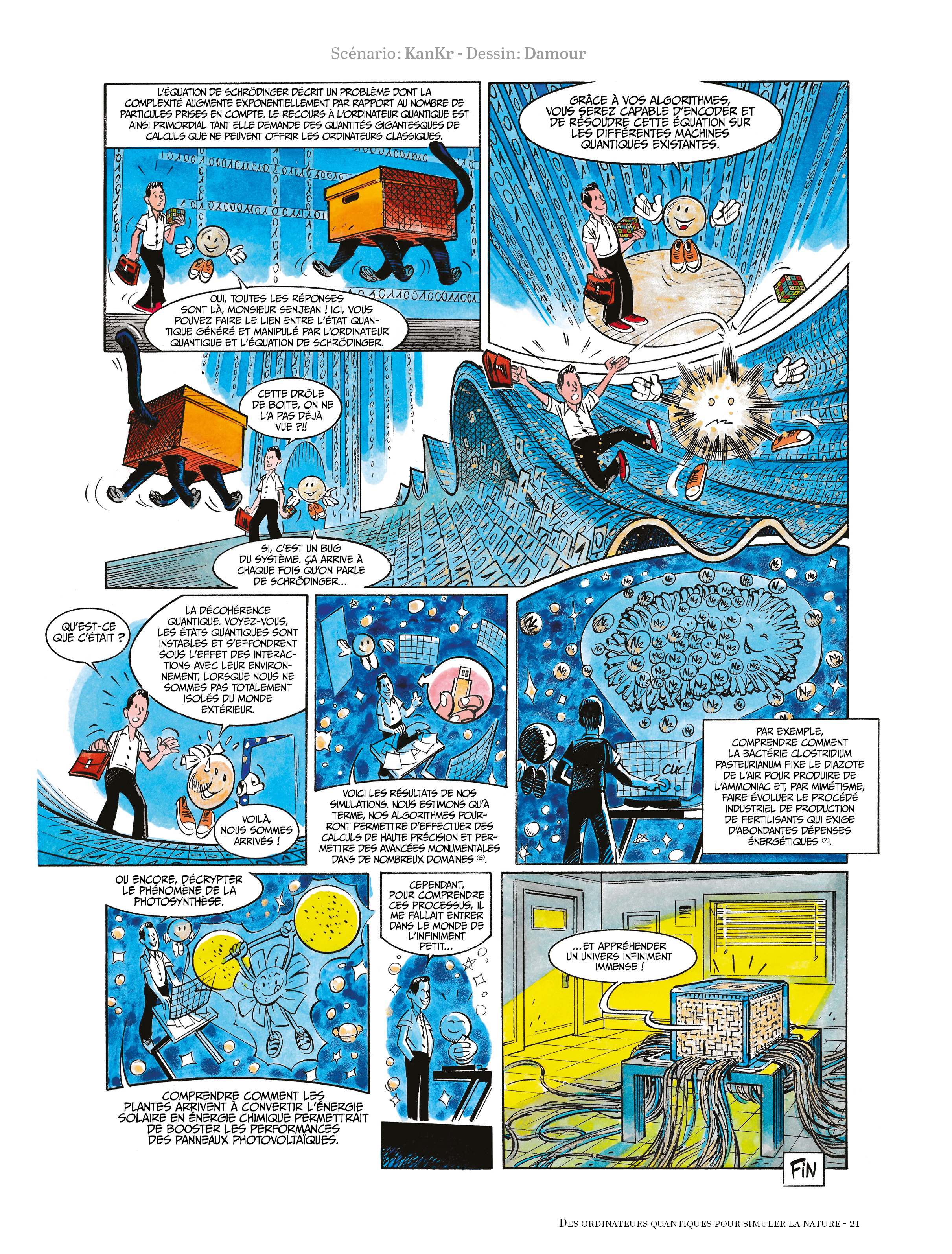 Bruno Senjean et son équipe travaillent sur un défi plus théorique, qui consiste à faire le lien entre l’équation de Schrödinger et l’état quantique généré et manipulé par l’ordinateur quantique. Ils développent des algorithmes capables d’encoder et de résoudre cette équa- tion sur les différentes machines quantiques, afin de simuler les propriétés chimiques des molécules présentes dans la nature [2][6]. Le jour où les ordinateurs quantiques surpasseront les capacités de calcul des ordinateurs classiques n’est pas encore venu, mais ils promettent de changer radicalement notre domaine de recherche pour la simulation de la matière, que ce soit en physique, chimie, ou biologie. Par leur puissance de calcul inégalée, les ordinateurs quantiques pourront effectuer des calculs de haute précision sur des systèmes de taille jusqu’alors inatteignable par les ordinateurs classiques, comme pour l’étude des complexes enzyme-substrat dans l’élaboration de nouveaux médicaments, ou le centre actif de la Clostridium pasteurianum pour l’agronomie, mais aussi dans bien d’autres domaines, comme la cryptographie et la cybersécurité pour renforcer la sécurité et améliorer les procéder de chiffrement des communications.