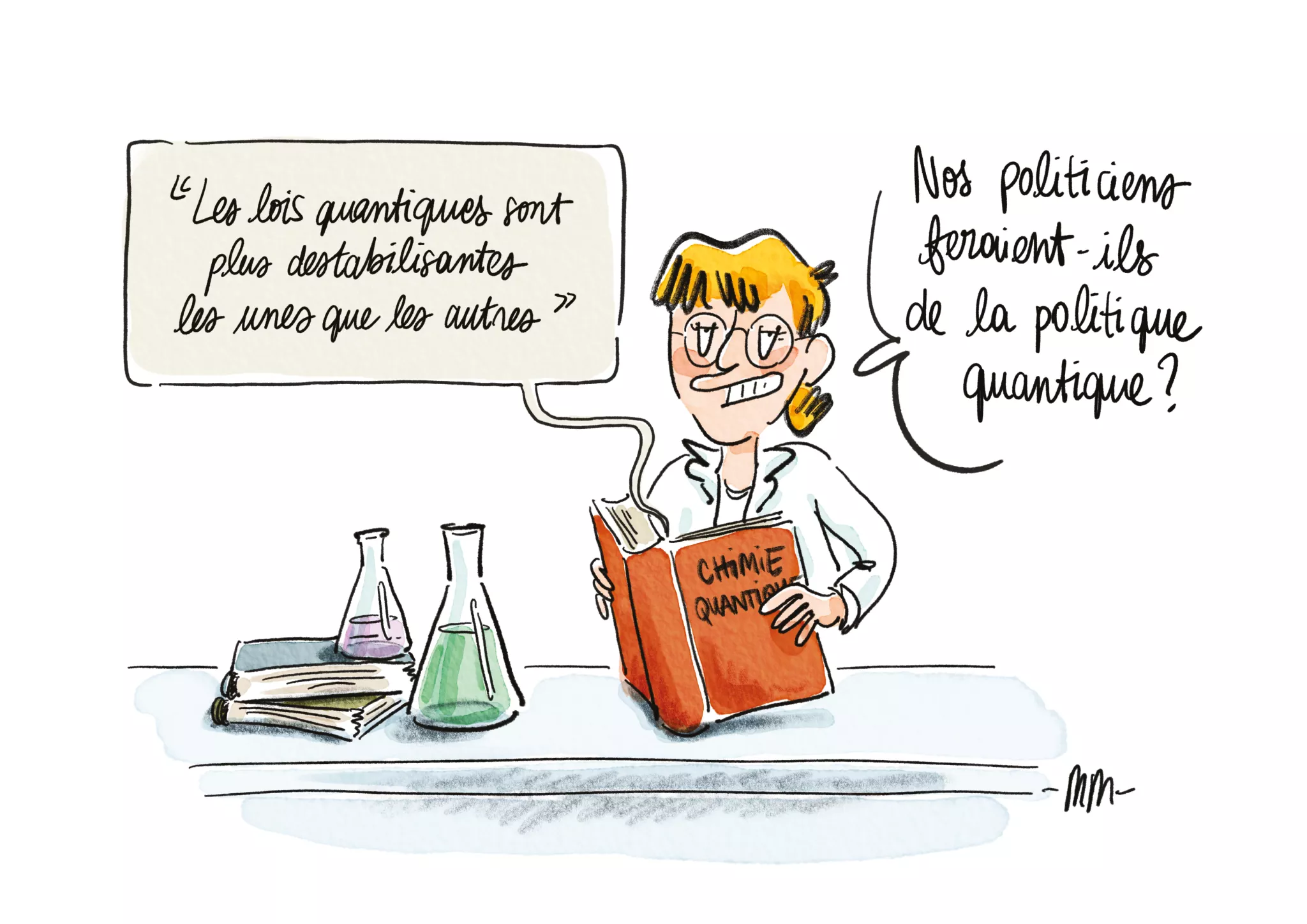 Pour comprendre les processus chimiques, il est nécessaire d’entrer dans le monde de l’infiniment petit. En effet, les propriétés physico-chimiques qui nous intéressent sont en réalité gouvernées par les interactions entre les électrons, ces particules chargées qui sont si petites qu’elles sont complètement invisibles à l’œil nu et qui tournent autour des noyaux des atomes, ces derniers formant la matière telle que nous la connaissons. L’épaisseur d’un simple cheveu peut contenir un million d’atomes! Mais plonger dans le monde de l’infiniment petit est loin d’être aisé. Il s’agit d’un monde régi par d’autres lois de la physique, des lois quantiques, plus déstabilisantes les unes que les autres. Une particule quantique aurait des pouvoirs dignes de ceux d’un super-héros! Elle pourrait traverser les murs (par effet tunnel), et être à plusieurs endroits à la fois (par superposition quantique), agissant comme une onde tant qu’on ne l’observe pas et redevenant particule quand on l’observe. C’est ce qu’on appelle la dualité onde-particule. Elle pourrait également influencer instantanément l’état d’une autre particule, même si celle-ci est infiniment éloignée (par intrication quantique). On dit alors que ces particules sont intriquées [4][5]. Nous et le monde macroscopique qui nous entoure n’échappons pas à ces lois de la mécanique quantique, cependant ces propriétés sont si instables qu’il faut être complètement isolés du monde extérieur pour les ressentir. Nous sommes si loin de cet isolement extrême que les effets quantiques sont tout simplement quasi instantanément réduits à néant à notre échelle. Ce monde est à la fois fascinant et bouleversant, si bien qu’un physicien renommé, Richard Feynman, a dit un jour « Si vous pensez comprendre la mécanique quantique, c’est que vous ne comprenez pas la mécanique quantique. »