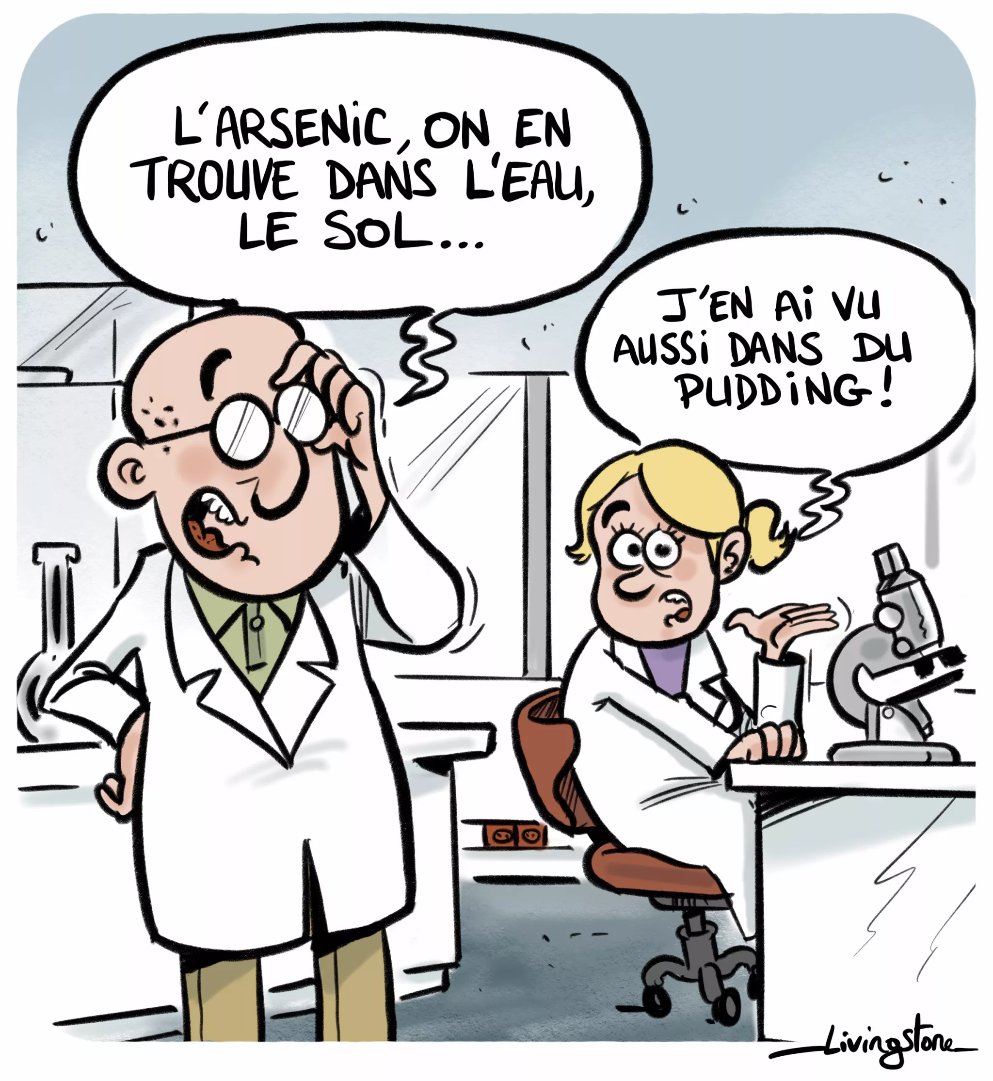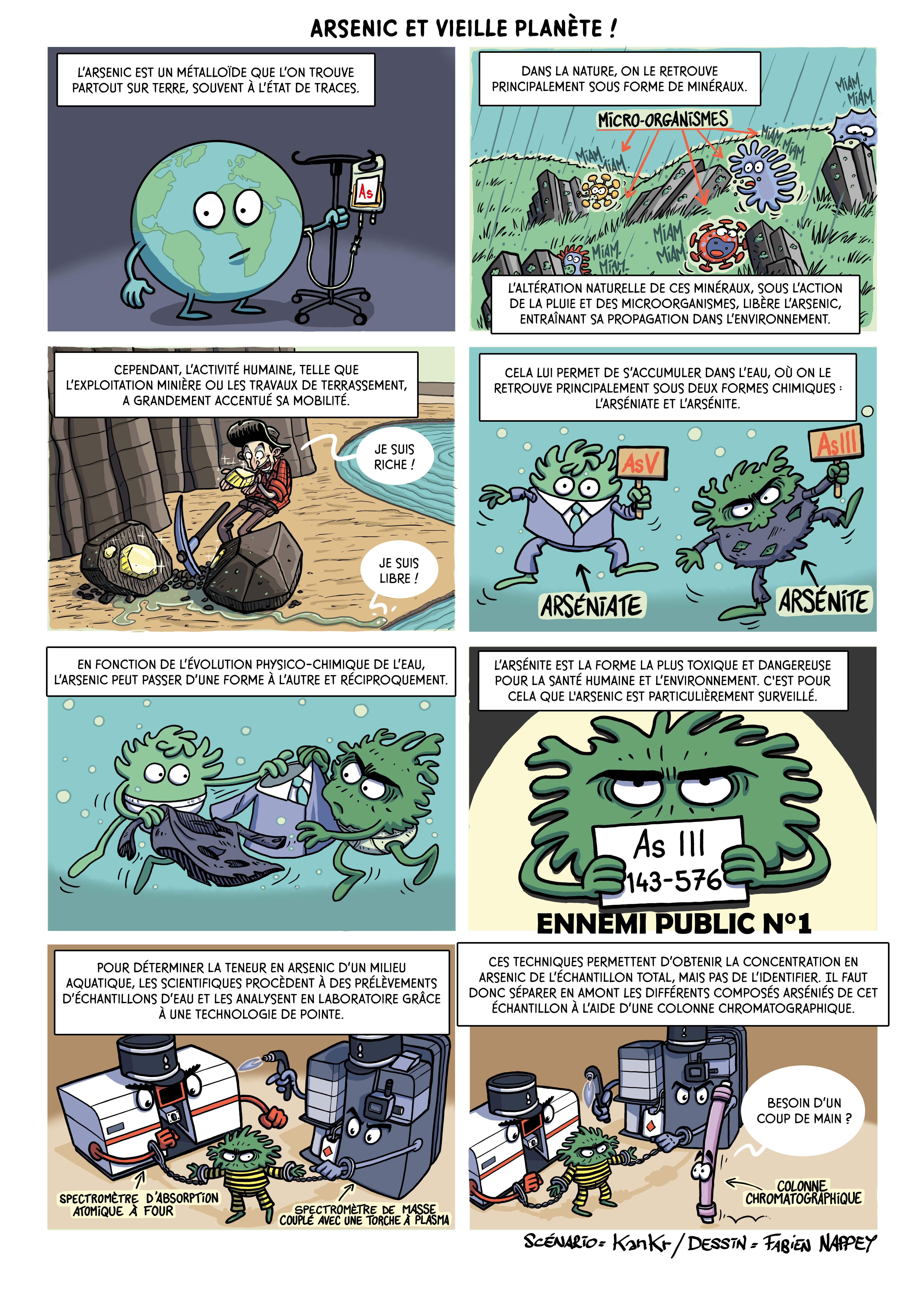 La toxicité de l’arsenic est principalement liée à son analogie chimique avec un composé essentiel au vivant : le phosphore. Cette ressemblance permet à l’arsenic de se substituer au phosphore lors de réactions au coeur des cellules des organismes, alors même qu’il empêche leur bon fonctionnement, le rendant ainsi potentiellement mortel. L’arsenic (III) est souvent reconnu comme étant plus toxique que l’arsenic (V). Aujourd’hui, le comportement géochimique particulier de ce métalloïde (multiplicité des états d’oxydation et fortes variations de mobilité et de toxicité) en fait un polluant prioritaire pour la protection des ressources en eau qui est intégré dans différents textes règlementaires (par exemple la directive européenne cadre sur l’eau 2000/60/CE, ou la directive européenne sur les eaux destinées à la consommation humaine 2020/2184).
