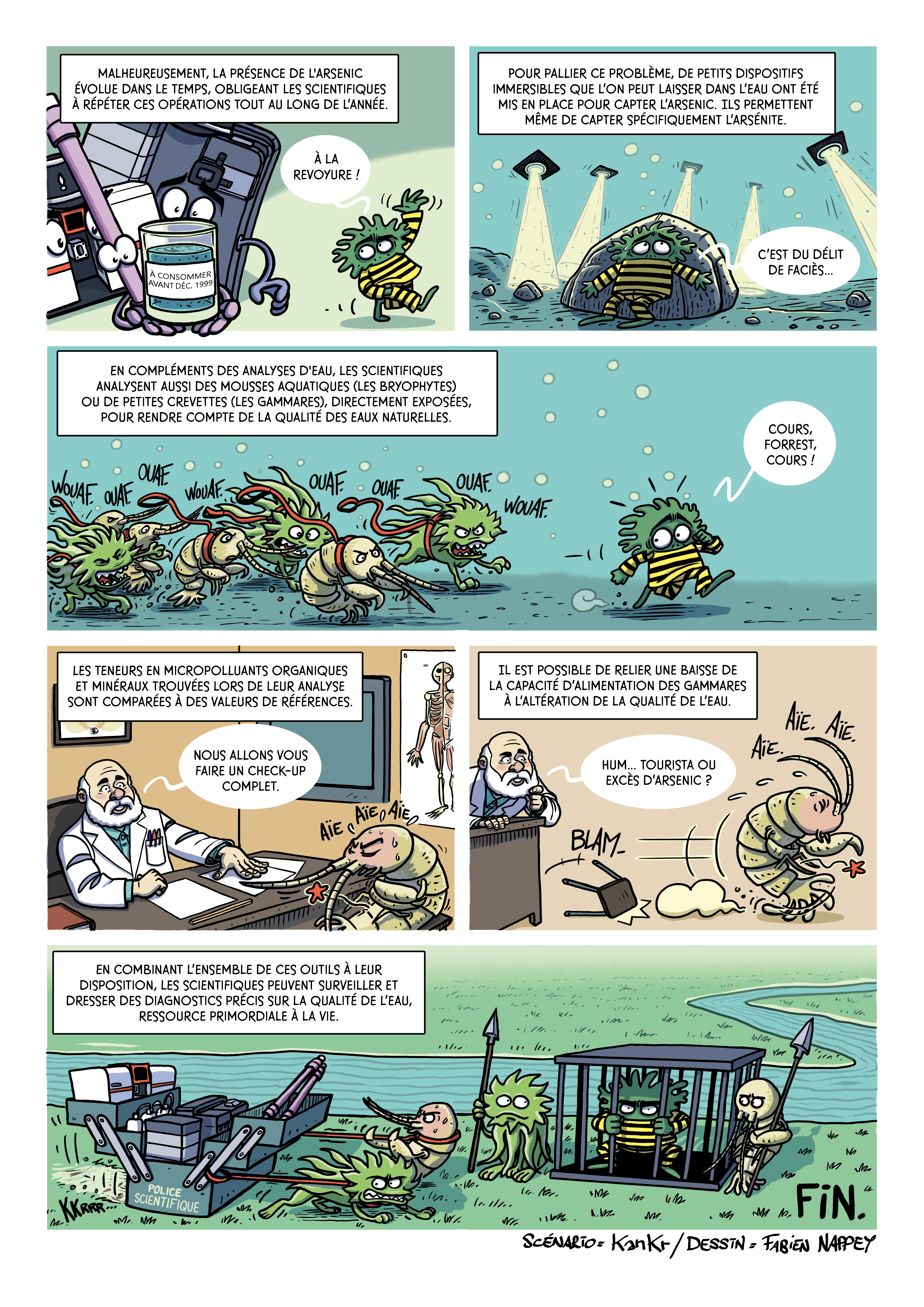 Différentes approches sont possibles pour déterminer la qualité des eaux vis-à-vis d’éléments chimiques pouvant l’altérer, comme l’arsenic. L’évaluation de la qualité d’une eau définit son aptitude à la vie aquatique, mais aussi aux usages humains comme celle destinée à la consommation humaine que l’on retrouve dans nos maisons pour boire, préparer nos aliments, se laver, etc. Les experts en charge de la surveillance de la qualité des eaux disposent d’une boîte à outils qui comporte des protocoles faisant appels à deux grands types d’approches : la recherche directe des éléments chimiques dans le milieu en utilisant des techniques d’échantillonnage et d’analyse adaptées, ou la recherche indirecte en évaluant l’effet des contaminants sur des organismes aquatiques. C’est souvent la combinaison de ces deux types d’approches qui fait la qualité du diagnostic, mais, quelles que soient les approches sélectionnées, il est primordial d’appliquer rigoureusement les protocoles expérimentaux, définis à la base par les travaux de recherche, pour obtenir les résultats d’analyse les plus fiables.