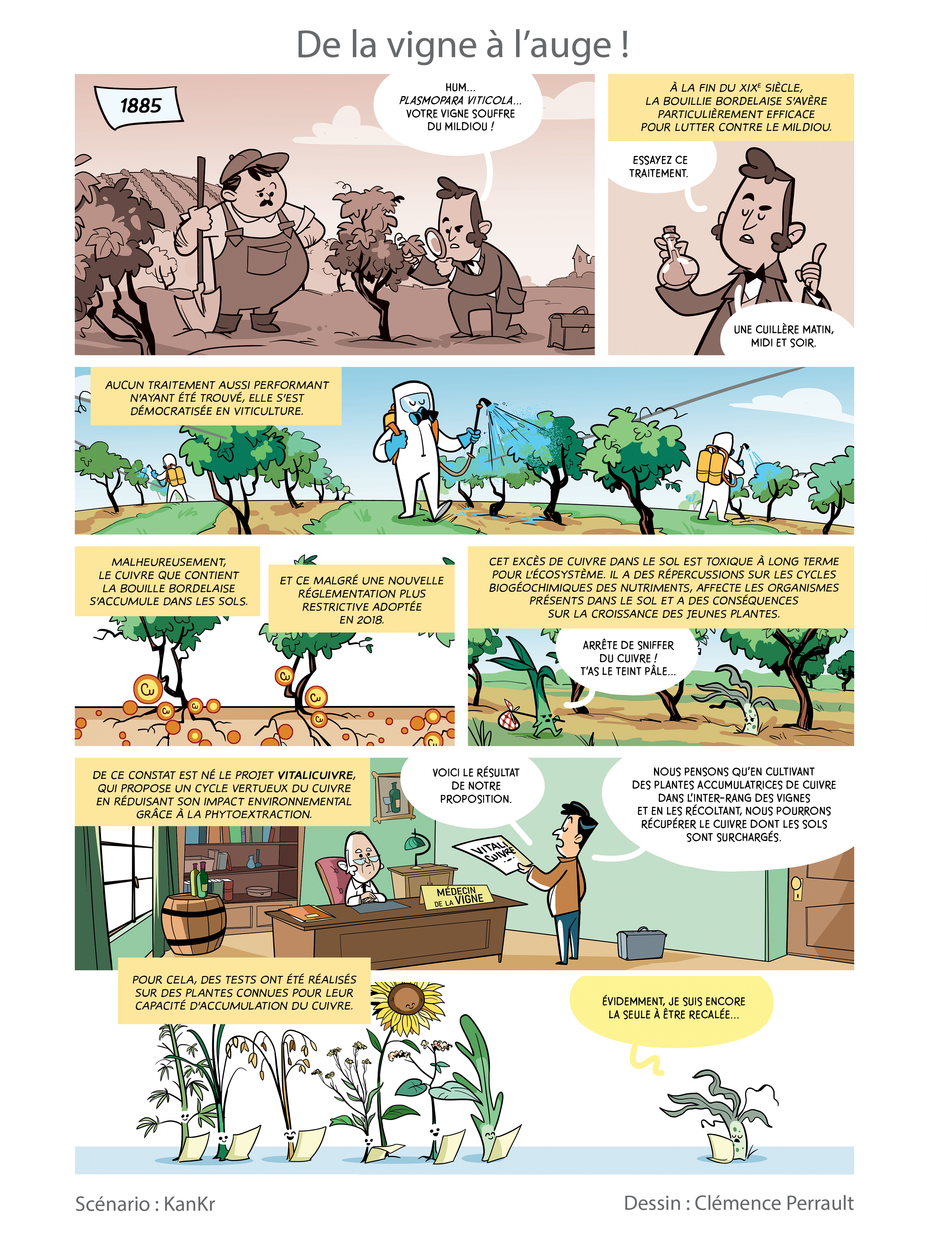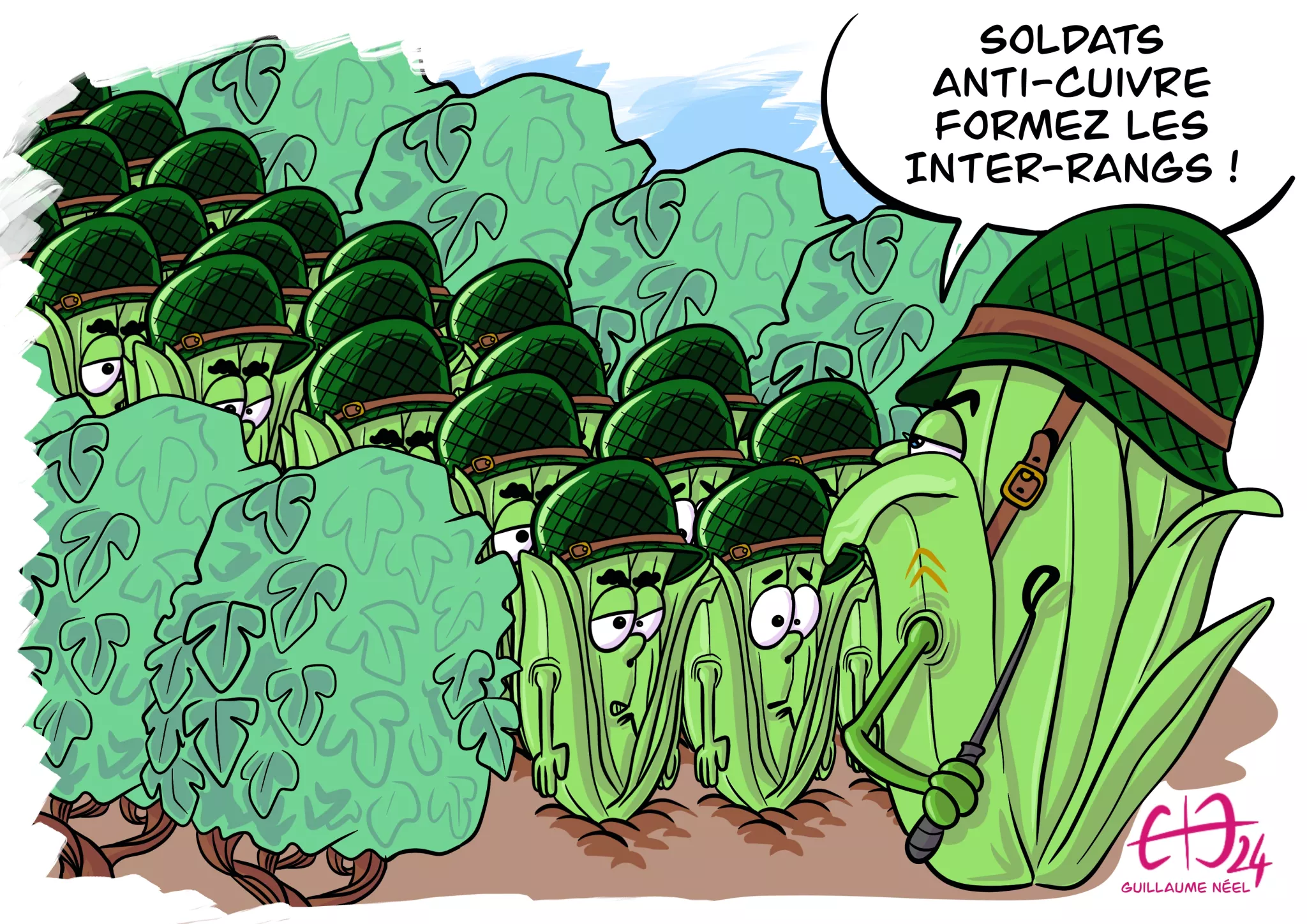 Largement utilisée en viticulture depuis la fin du xixe siècle, la bouillie bordelaise – mélange de sulfate de cuivre et de chaux éteinte – permet de lutter contre le mildiou et l’oïdium, deux champignons qui se développent sur la vigne depuis des décennies. Or, en dépit de la réglementation de 2018 visant à réduire les quantités à ne pas dépasser (4 kg de cuivre en moyenne par hectare et par an), le cuivre, toxique en trop grande quantité pour les organismes et micro-organismes vivant dans le sol, continue de s’accumuler et de le contaminer.