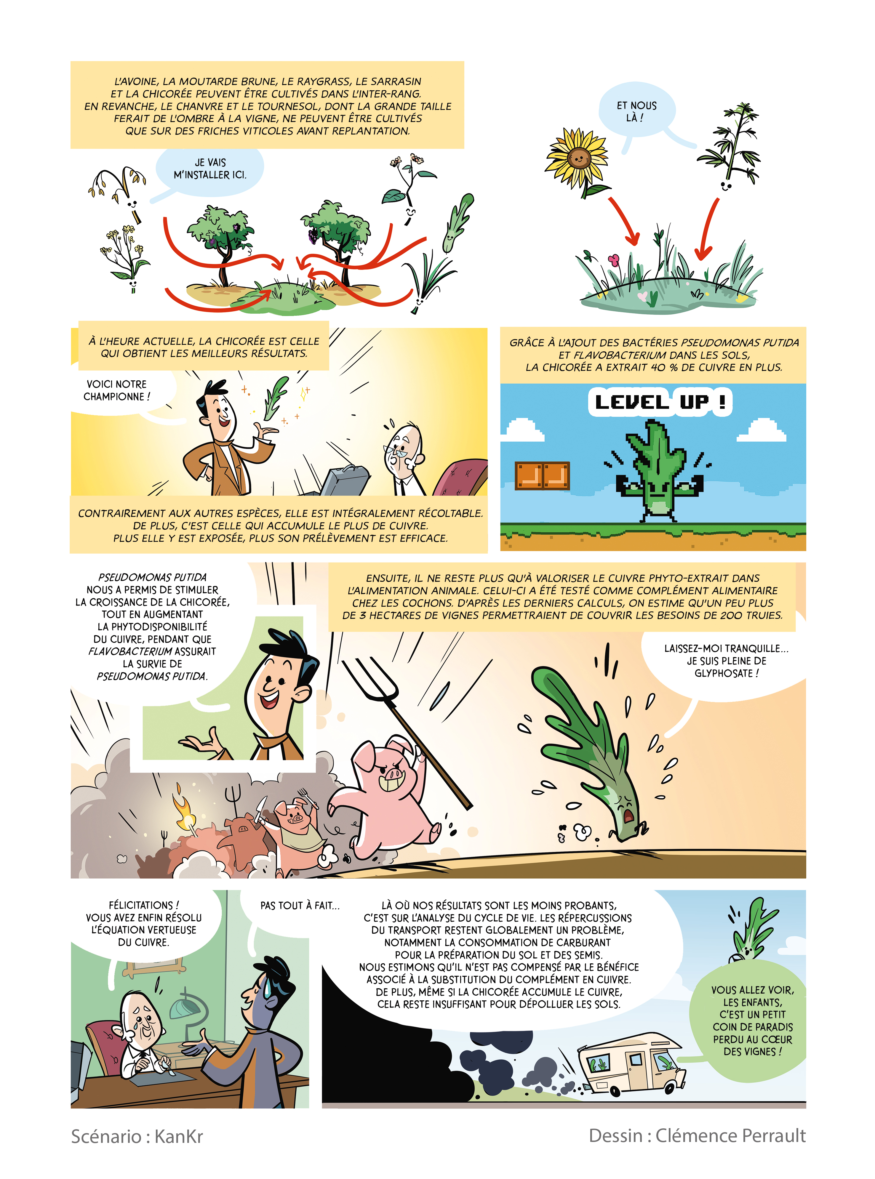 En 2023, c’est globalement le sarrasin qui a concentré le plus le cuivre. Mais en termes de rendements de phytoextraction (de quantité de cuivre extrait), la chicorée a donné de meilleurs rendements, notamment parce qu’elle présente l’avantage d’être intégralement récoltable (parties aérienne et racinaire), à la différence des autres espèces. Pour autant, les résultats, à ce stade de l’étude, sont insuffisants puisque les quantités de cuivre extraites du sol par phytoextraction ne représentent qu’une infime partie des quantités de cuivre épandues par les viticulteurs pour lutter contre le mildiou (à peine 10 %). Il reste donc près de 90 % de cuivre dans le sol après l’expérimentation.
