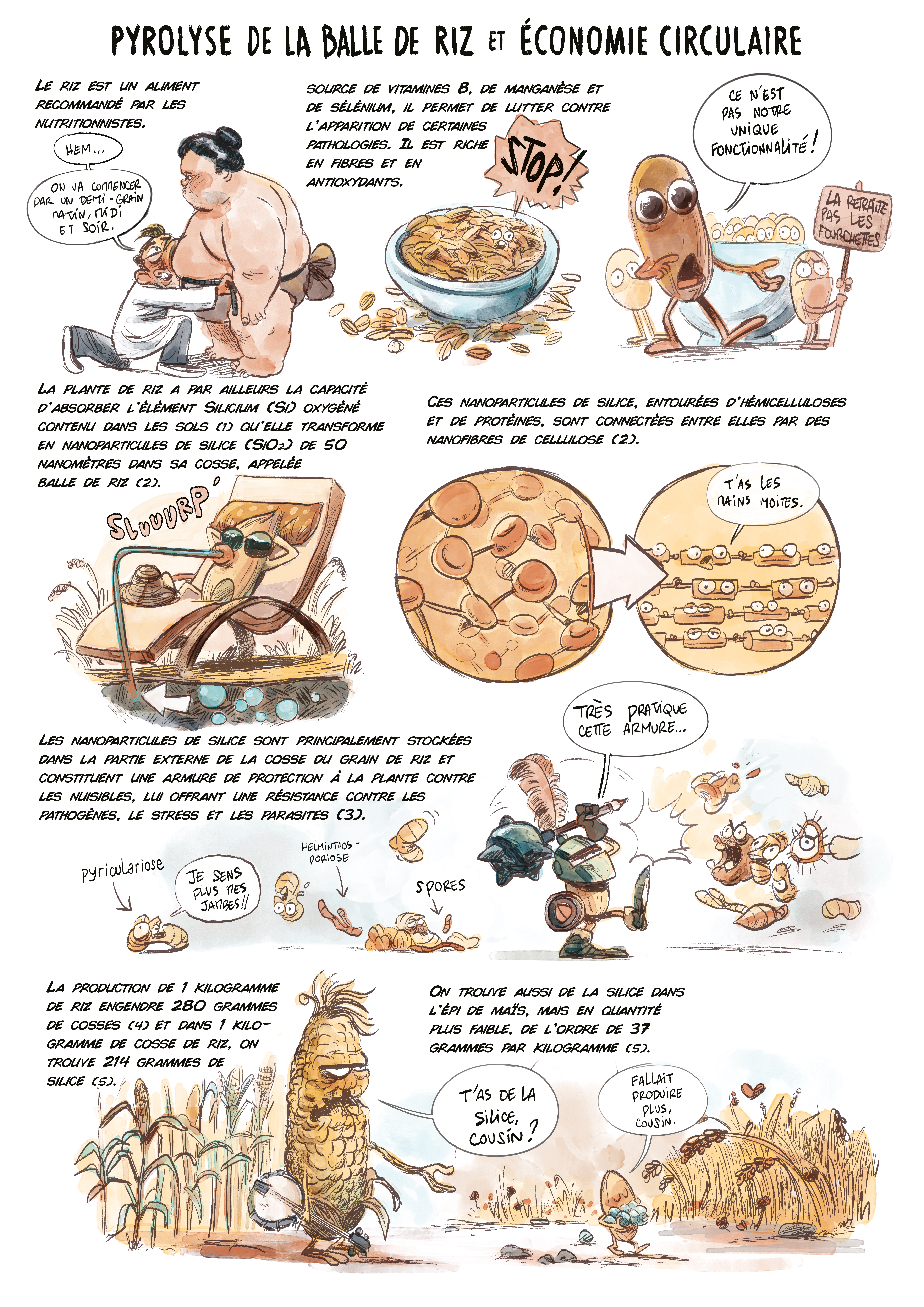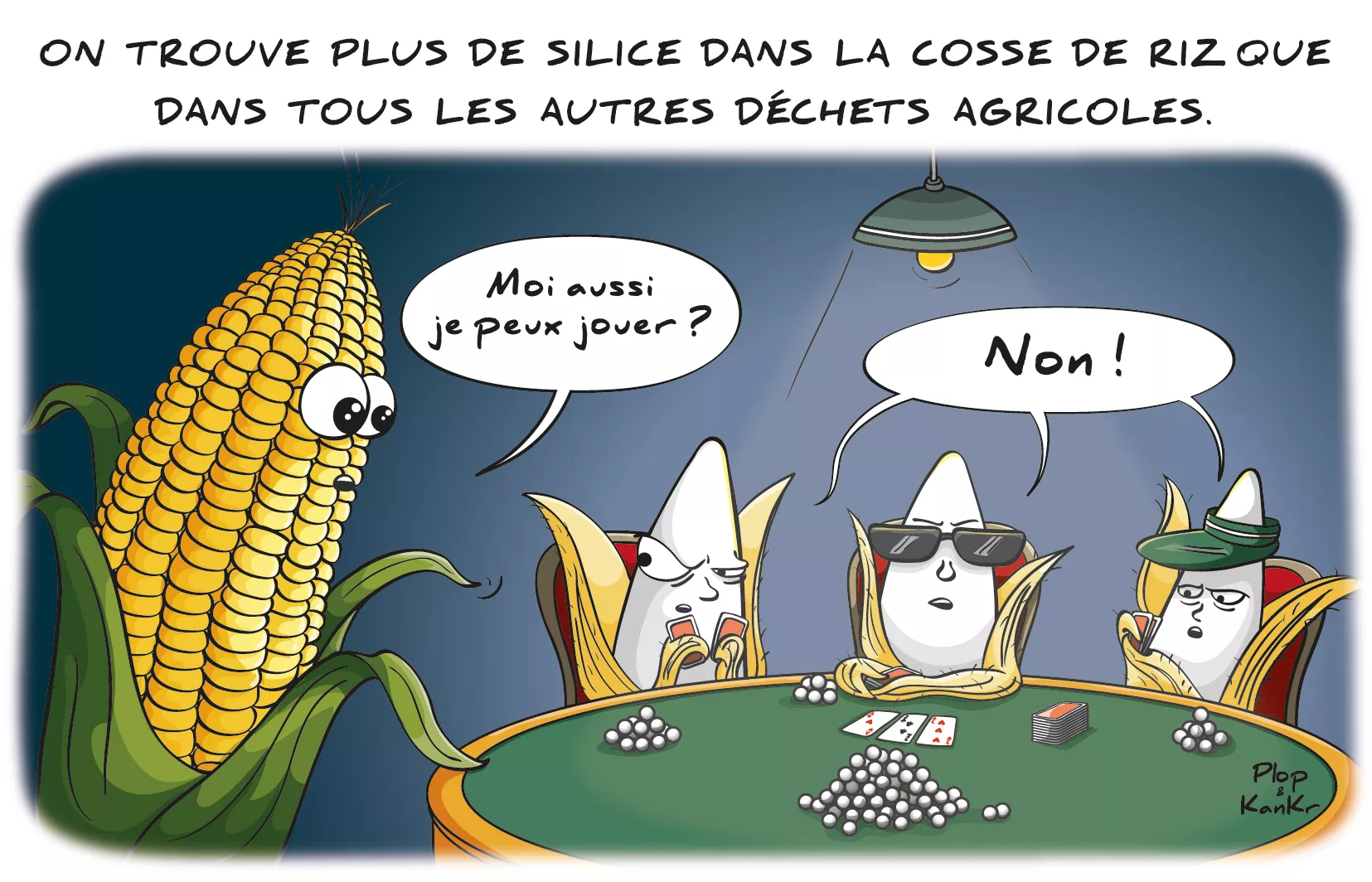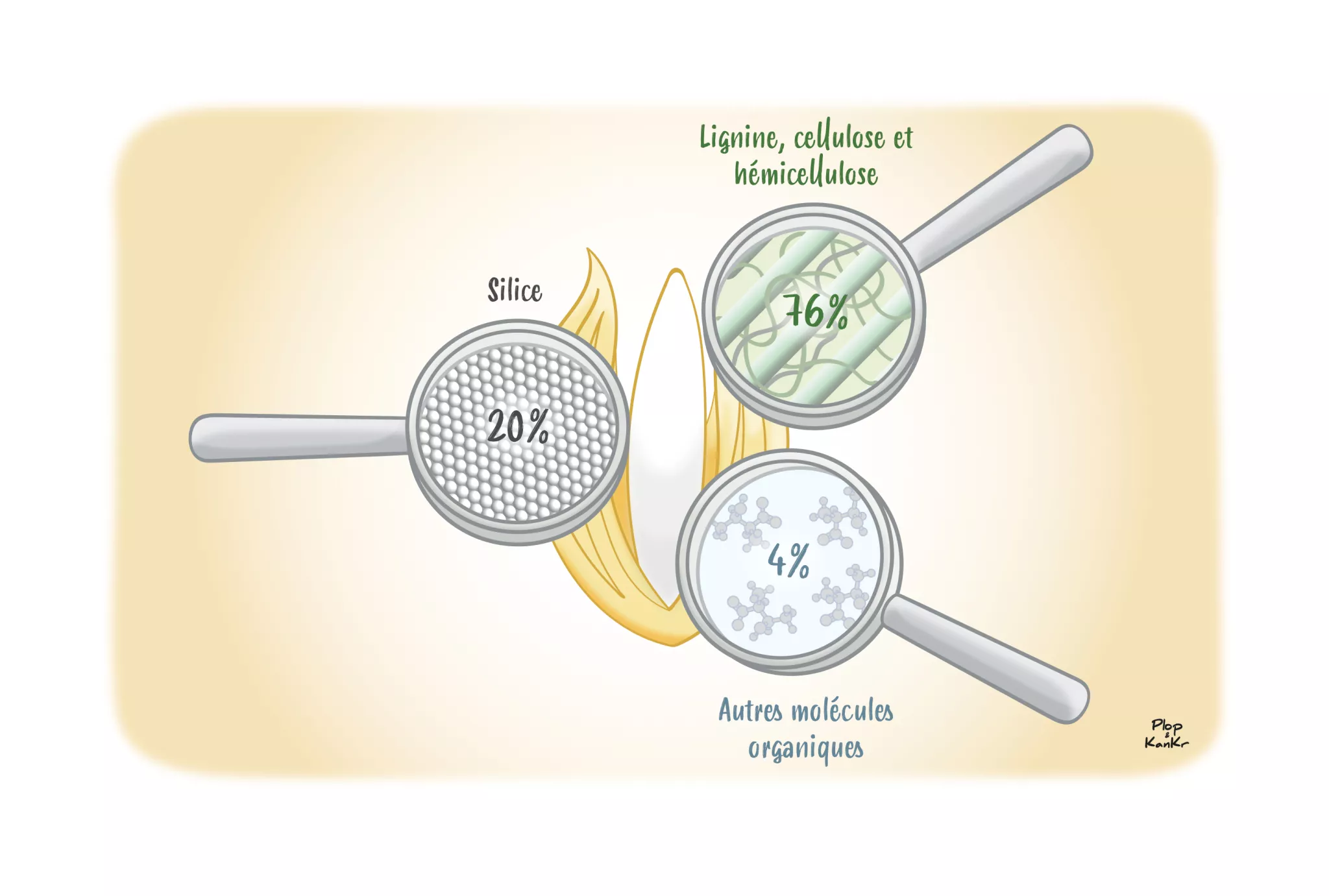 Loin devant d’autres cosses, comme celle du blé, ou d’autres parties de la plante de riz, la balle de riz est le déchet de biomasse qui contient la plus grande quantité de silice avec environ 210 g de silice par kilo de cosse [5]. Principal constituant inorganique de ce type de balle, la silice est extraite du sol par les plants de riz [1], puis stockée sous forme de petites particules de 50 nanomètres (des milliardièmes de mètres). Ces particules sont alors reliées entre elles par des fibres de cellulose – un composant de la lignocellulose –, dans la partie externe de la cosse [2]. L’objectif est de protéger les grains de riz des agents extérieurs, que ce soit des conditions climatiques défavorables, des parasites ou d’autres agents pathogènes [3].