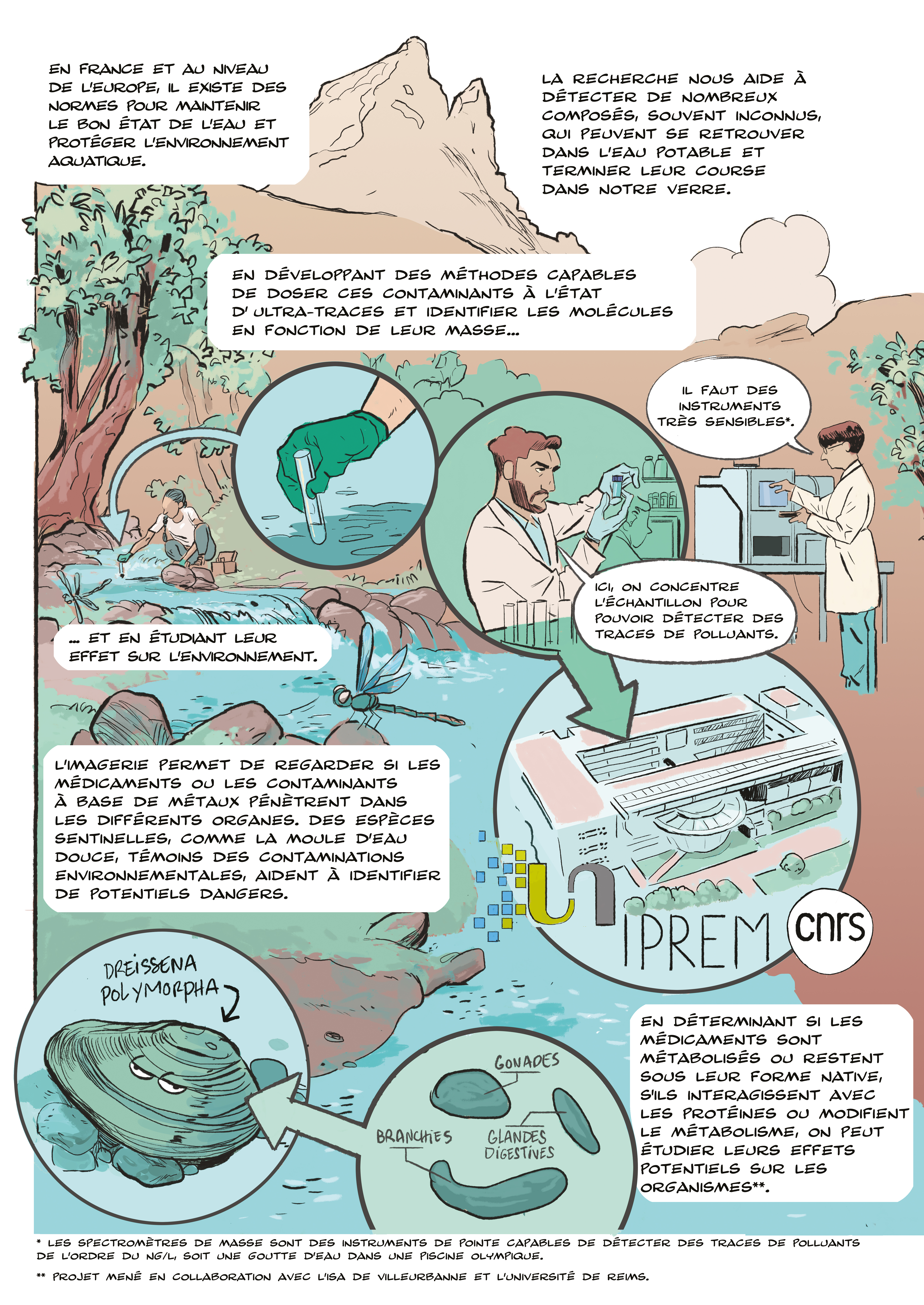 À l’Institut des Sciences Analytiques et de Physico-Chimie pour l’Environnement et les Matériaux (IPREM) de l’Université de Pau et des Pays de l’Adour/CNRS, les chercheurs s’intéressent plus particulièrement au suivi des médicaments comportant des éléments spécifiques comme les métaux (on parle alors de « métallo-médicaments ») ou les halogènes (l’iode par exemple) dans les cours d’eau, et sur l’étude de leur effet sur les organismes aquatiques. Certains de ces médicaments pouvant être métabolisés, il est nécessaire de développer des méthodes dites « multirésidus », permettant de détecter et quantifier les différents métabolites. En effet, le degré de toxicité d’un métal (ou halogène) étant lié à sa nature mais aussi à sa forme chimique, il est primordial d’analyser sa spéciation, c’est-à-dire d’identifier les différentes formes de l’élément chimique. Par exemple, le méthylmercure obtenu par biotransformation du mercure par les microorganismes est plus toxique que le mercure en lui-même.