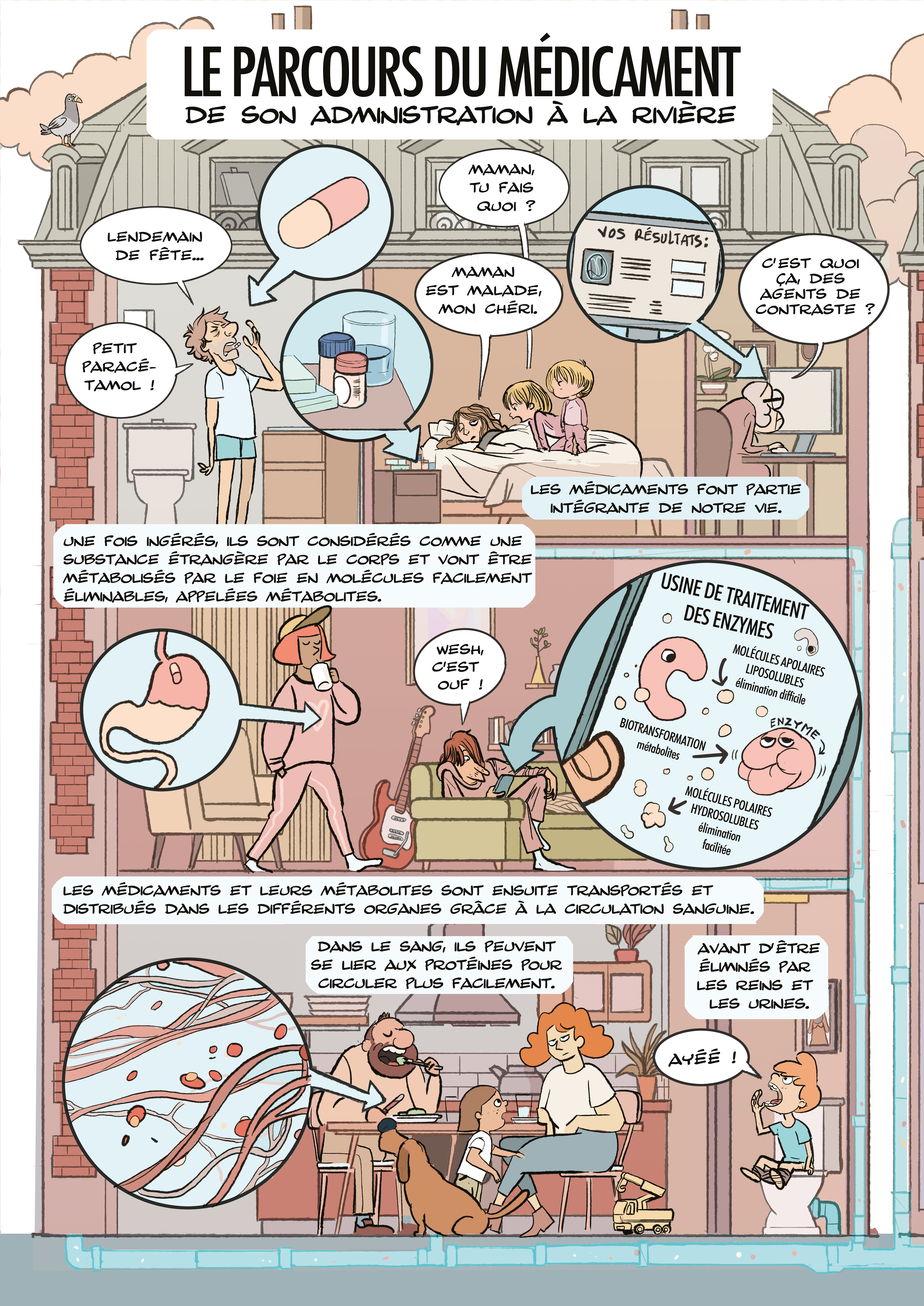 À chaque mal, un remède. Mais que deviennent tous ces médicaments une fois dans le corps ? Tout dépend du médicament et de son mode d’administration. En effet, pour être efficace, le principe actif du médicament (c’est-à-dire la ou les molécules ayant un effet thérapeutique) doit être délivré au bon endroit et au bon moment. Pour cela, il est mélangé à des excipients. Ces substances, sans effet thérapeutique, jouent un rôle sur le conditionnement (gélule, comprimé, solution injectable…), le goût, et surtout sur la libération du principe actif dans le corps et son absorption par les cellules. Par exemple, lorsqu’ils sont administrés par voie orale, les médicaments passent d’abord dans l’estomac avant d’atteindre les intestins, où une partie sera diffusée dans la circulation sanguine et le foie. Ainsi, pour éviter leur dégradation par l’acidité de l’estomac, certaines gélules dites « gastrorésistantes » sont employées pour que le principe actif soit diffusé au niveau des intestins. Les médicaments sont ensuite métabolisés, c’est-à-dire transformés en des molécules facilement éliminables. Cette étape est principalement réalisée dans le foie grâce à des protéines appelées « enzymes » qui ont la particularité de catalyser, c’est-à-dire d’accélérer les transformations chimiques dans les systèmes biologiques (on trouve également des enzymes dans les intestins pour digérer les aliments, comme la lactase qui dégrade le lactose du lait). Le principe actif et ses produits de dégradation, appelés « métabolites », sont ensuite distribués dans les cellules des différents organes grâce à la circulation sanguine. Pour faciliter leur transport dans le sang, certaines molécules peuvent se lier à des protéines plasmatiques (protéines présentes dans le plasma, la partie liquide du sang). Elles sont ensuite éliminées par voie rénale dans les urines, ou par voie biliaire via le foie.