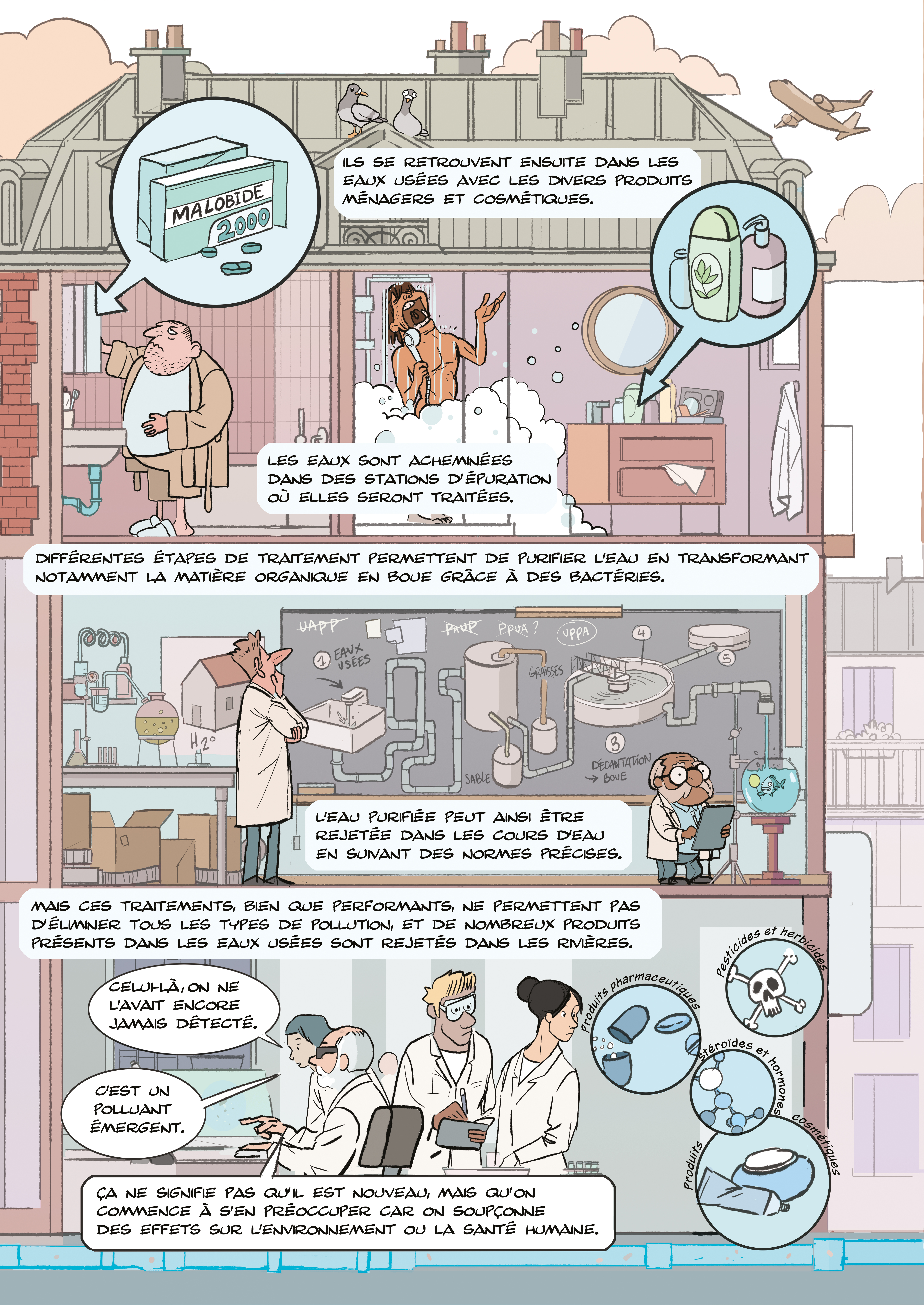 Dans les stations d’épuration, les eaux subissent différentes étapes de traitement. Les plus gros déchets sont éliminés dès leur entrée à travers un dégrilleur, une sorte de tamis permettant de retenir les déchets les plus volumineux, comme les sacs plastiques, le papier, le bois, les feuilles, ou encore les cheveux. Une étape de décantation permet ensuite d’éliminer les matières plus lourdes que l’eau, comme le sable ou le gravier (dessablage), et les huiles et graisses sont récoltées en surface (déshuilage). S’ensuit un traitement biologique dans lequel des bactéries se nourrissent de la matière organique provenant des sucres, des protéines et de la pollution, et dégradent les composés azotés et phosphorés (provenant essentiellement des urines). La multiplication des bactéries produit une boue biologique qui peut être facilement éliminée par décantation. L’eau, ainsi purifiée, peut être rejetée dans les cours d’eau. Cependant, ces traitements, bien que très performants, ne permettent pas d’éliminer tous les types de pollution, et la plupart des médicaments, tout comme les tensioactifs utilisés dans les produits cosmétiques (molécules permettant de solubiliser dans l’eau des composés initialement non solubles dans l’eau comme les graisses), finissent malgré tout dans les cours d’eau [1].