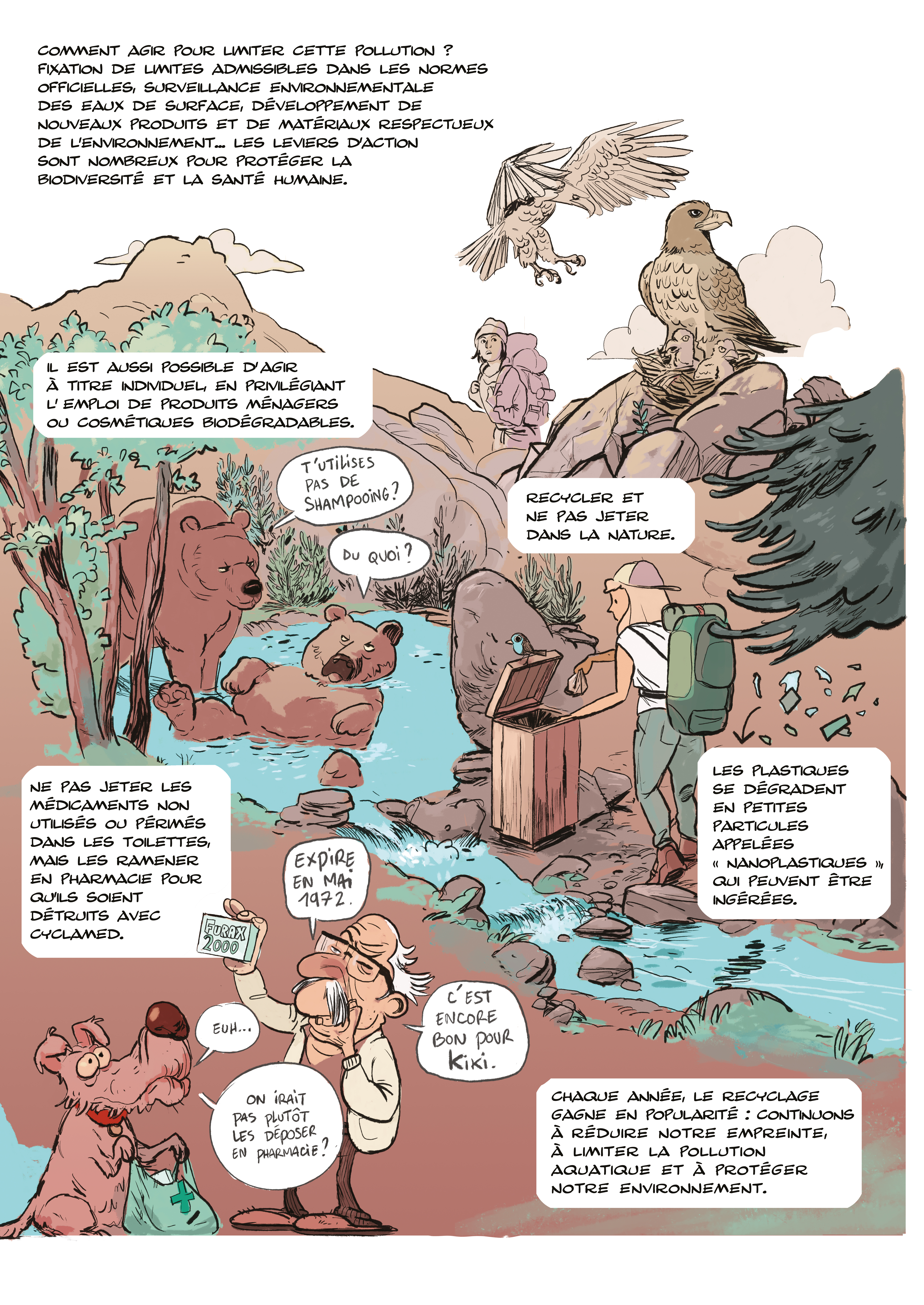 À titre individuel, il est également possible d’agir ! Ne pas jeter les médicaments non utilisés ou périmés dans les toilettes, mais les ramener en pharmacie pour qu’ils soient détruits (« Trier, apporter, préserver » avec les campagnes de l’association Cyclamed), ou privilégier l’emploi de produits ménagers ou cosmétiques facilement biodégradables, recycler et ne pas jeter dans la nature… autant de petits gestes pour réduire notre empreinte, limiter la pollution aquatique et protéger notre environnement !