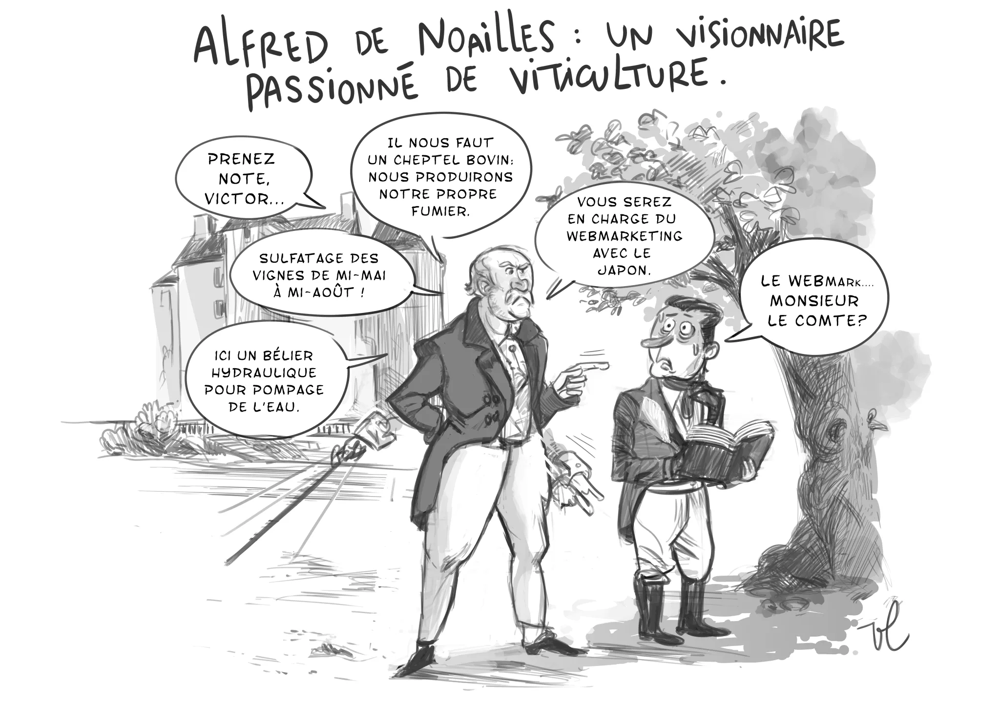 Notre travail universitaire a aussi permis de « redécouvrir » un personnage-clé de l’histoire viticole de la région : Alfred de Noailles, qui fut châtelain de Buzet de 1852 à 1895. Gentleman agronome, Alfred modernisa à grands frais son domaine, mettant en place de nouvelles méthodes (fumage, sulfatage), introduisant de nouveaux cépages rouges (malbec, bouchalès, jurançon rouge, mauzac), et rationalisant les usages, dans une optique d’économie circulaire. Il tripla les surfaces dédiées à la vigne, fit du vin de Buzet un grand cru qui s’exportait à l’international, et réussit à contenir sur son domaine la terrible épidémie de phylloxéra qui ravageait toutes les vignes françaises. Il fut élu maire de Buzet et ses méthodes firent rapidement école. Pourtant, après sa mort, son domaine périclita prestement et sa mémoire fut rapidement oubliée. Avec l’accord de la Coopérative qui voit en Alfred un illustre prédécesseur qui sut s’adapter et moderniser son vignoble, nous avons mis en avant l’action de ce personnage haut en couleur, qui peut aussi symboliser l’excellence du vignoble du château. La mairie vient d’inaugurer une salle « Alfred de Noailles », preuve de l’engouement suscité par la redécouverte du personnage. Ce travail sur les vignes du château a aussi permis de cartographier des vignes anciennes et de déterminer qu’un peu plus de 7 ha de vignes encore actuellement exploitées par la Coopérative avaient autrefois produit du vin du château. Cela a permis la recréation d’une appellation « château de Buzet », qui est commercialisée depuis l’hiver dernier.