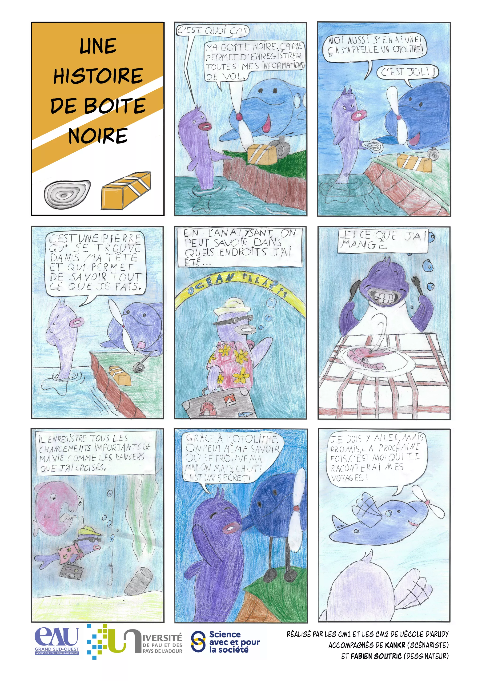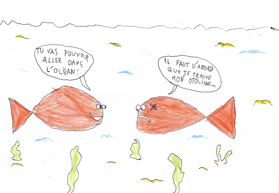 Lors de cette édition, le chercheur Gilles Bareilles a présenté aux élèves de CM1 et CM2 de l'école d'Arudy, ses travaux de recherche sur l'otolithe, accompagné des artistes Plop (dessinatrice) et KanKr (scénariste).